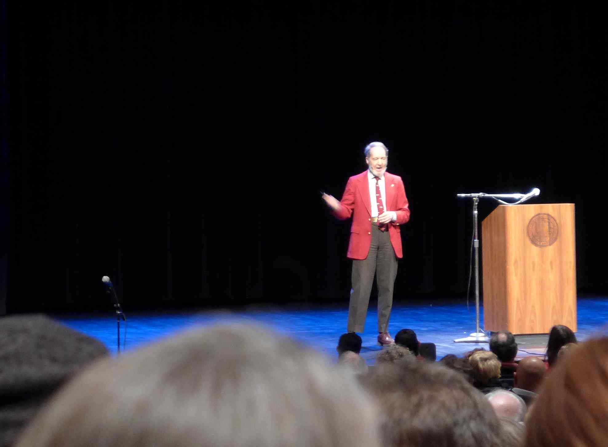 Incidentally, and à propos of not much but my interest in performers: As an onstage performer Diamond is a peculiar creature. With his trim figure, his white Abe Lincoln beard, his bright red sport jacket, and his very weird accent — Boston/Jewish, as it turns out — he’s like an elfin wizard-creature out of Tolkien. And he’s as pedantic as you’d expect a successful veteran prof to be. Even when he goes off-book he speaks like a term paper. He states and restates his points; his sentences are full of fillers like “conversely” and “in short.” (Which left me wondering: Are some people genetically destined to become professors?) But maybe the package is theatrically effective anyway. Maybe to his audience it conveys “I’m a serious and eccentric — yet also bizarrely lovable — intellectual.”