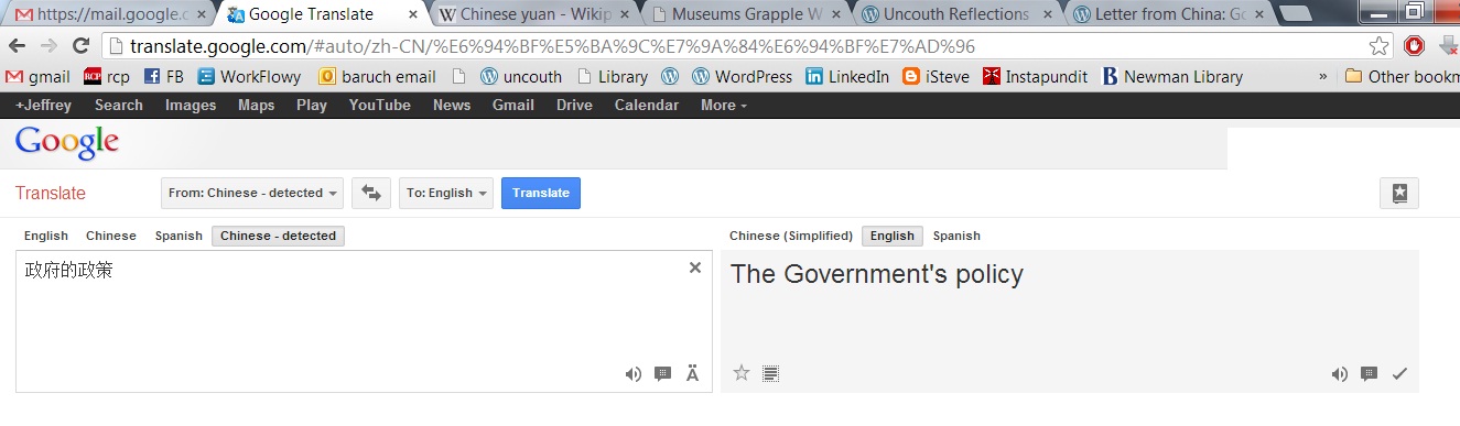 From time to time, though, Google Translate will return an answer that seems curiously revealing. I wanted to find the Chinese term for “government policy”–the regular, lower-case term for the basic thing that government does as it undertakes action. When you take the Chinese term for the term and re-translate it back into English, you find you get a subtle difference: