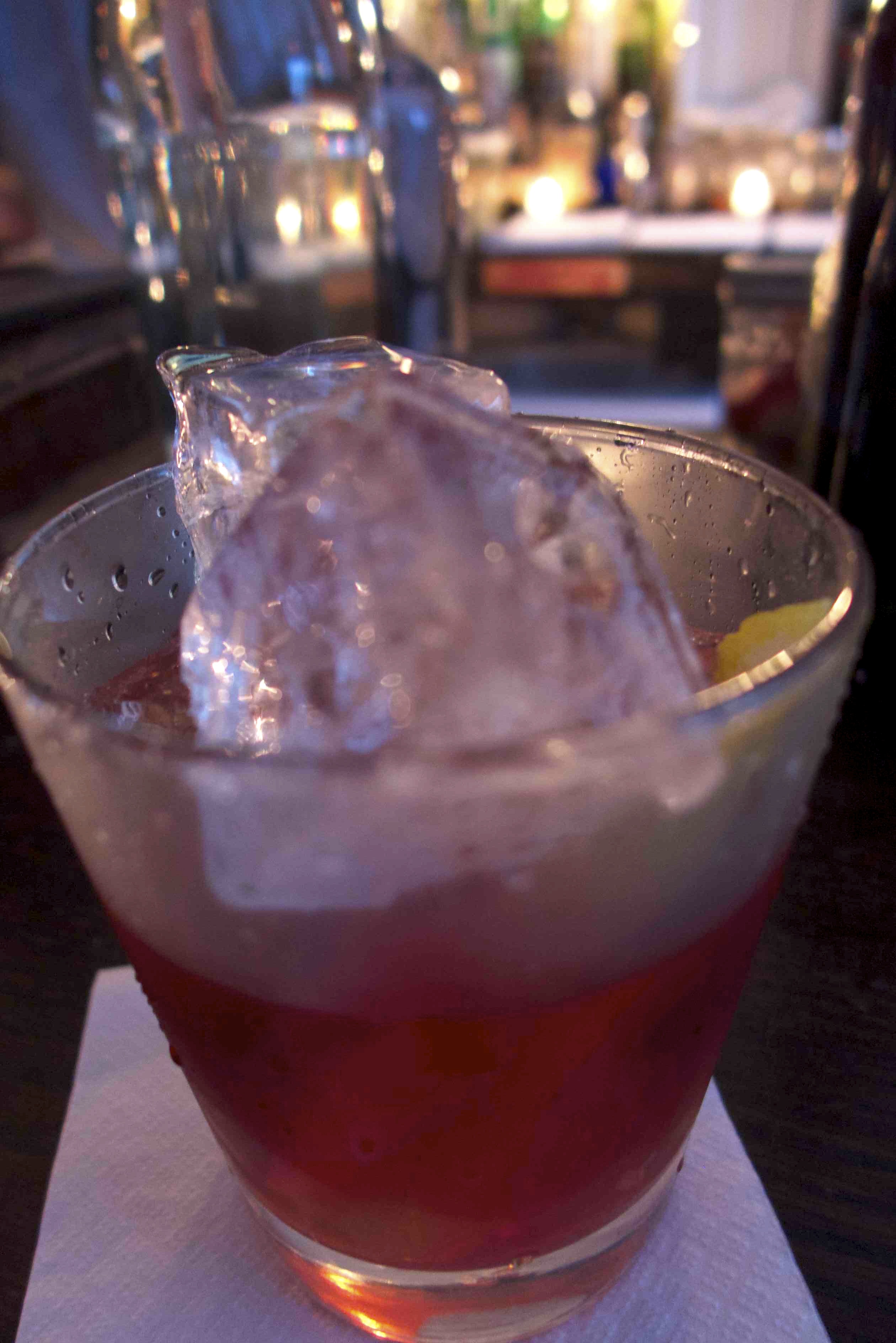 But, after some months away, the Question Lady and I are now back in NYC, where the cocktail renaissance has been in full swing for a longish while. If New York’s virtuosic mixologists don’t know what to do with a Negroni, then no one does. So the other evening I dragged my wife off to Elsa, a well-respected little place in Alphabet City (that’d be the East East Village to some of you). On their Classic Cocktail list they offered a Negroni described as “barrel-aged,” something I’d never run across before. The basic elements of the Negroni are there — gin, sweet vermouth, Campari. But instead of being mixed in front of your eyes, they’re pre-mixed; and then the mix is aged in a charred oak barrel for a month. When a customer orders the drink, the barrel-aged mix is poured over ice — as you can see in my snapshot, the mixologists at Elsa take some serious care with their ice — and an orange slice.