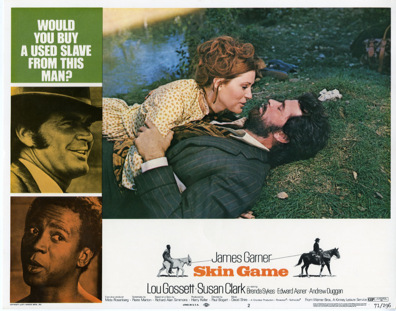 “Skin Game” has the modest charm of a joshing tall tale or a comic folk ballad. Given its premise, which involves a bi-racial duo of con men who repeatedly allow the black partner to be sold into slavery so the white one can bust him out a few hours later, it seems reasonable to assume it was a major source for Tarantino during the writing of “Django Unchained.” The movie is perfunctory looking, like a made-for-TV production, and director Paul Bogart lacks either the skill or the temperament needed to bring out the mischievousness built into the situations (there is a Lubitsch-y quality to parts of Peter Stone’s screenplay), but each scene has its own tempo and punch line, and the performances are consistently enjoyable. As Quincy, James Garner looks healthy and self-pleased; he’s doing “Maverick” as facetious mastah. And Louis Gossett, Jr., who plays his partner Jason, is an appealing straight man, one whose routine gains edge through the high-stakes nature of the game being played. (Jason has everything to lose.) As a team Garner and Gossett sometimes call to mind the chummy-combative male pairings common to Warner Brothers pictures of the ’30s and ’40s. They’re a hoot. Rounding out the main cast is Susan Clark, who manages to make the flintiness of her Ginger seem like an accessory to flirtation. The three of them appear to be enjoying their time together.
