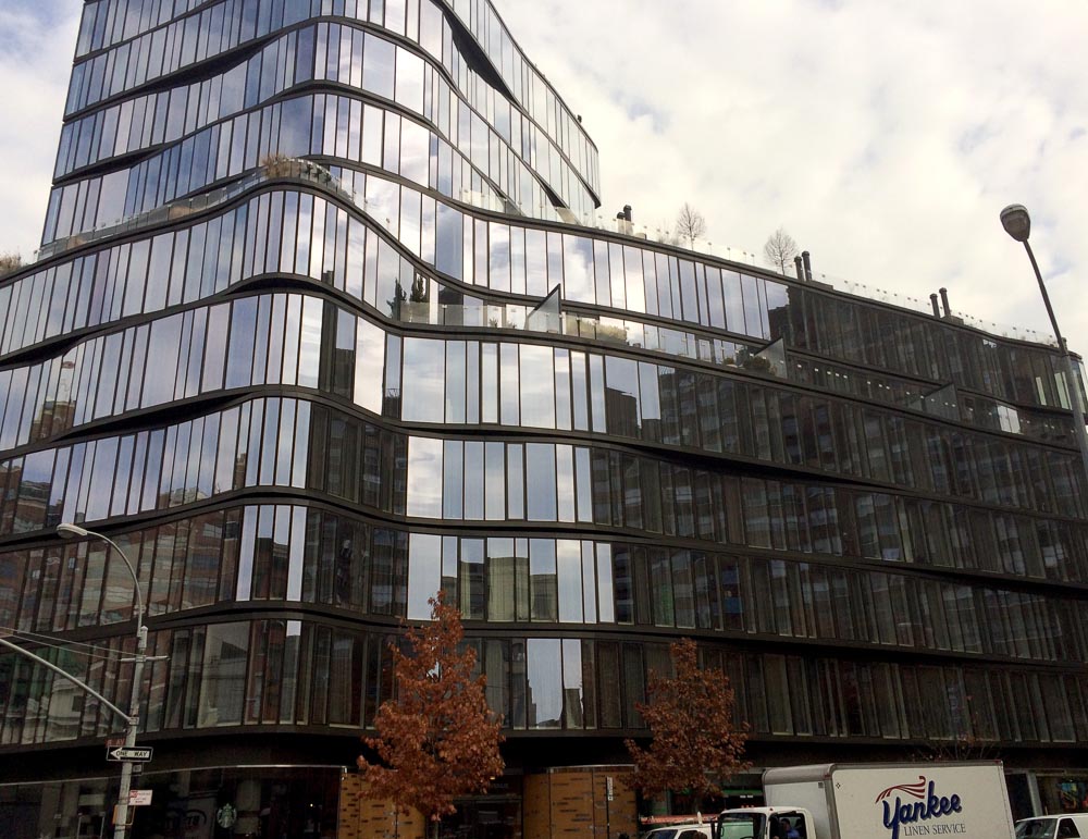 A recently-finished arrival in the West Village: Black brick, super-reflective windows, and trendy wibbly-wobbliness. Why? Well, just because. (In fact, the wibbly wobbliness we’re seeing so much of these days is supposed to correct some of what was widely acknowledged to be wrong with early modernist buildings — their maniacal emphasis on lines, planes and rectilinear geometry.) To my eyes this particular building looks like a just-washed piece of belly-dancing fabric hung out on the line to dry in the breeze.