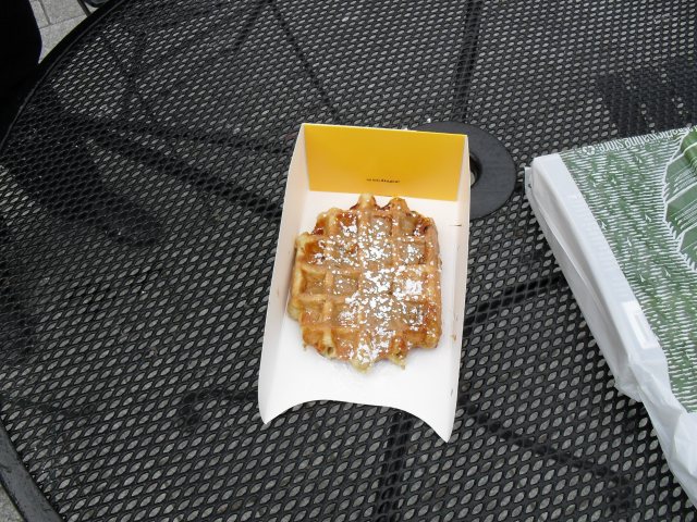 Well, a waffle truck cannot be passed without decisive waffle action being taken, so a waffle was purchased. The “Liege” variant, the chewier of the options, doused liberally with spekuloos spread. Spekuloos can be described as ginger biscuits mashed into a peanut-butter-textured spread, or more simply, as spreadable orgasms. Ahem.