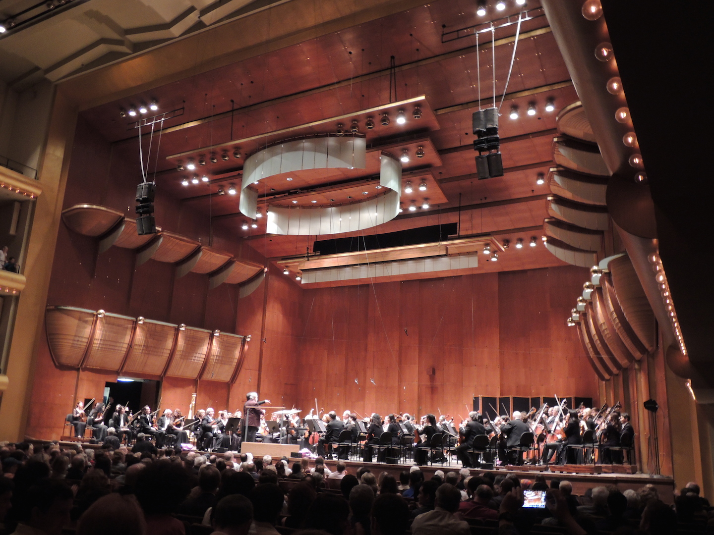 The second piece was a violin concerto by Peter Eötvös written specifically for soloist Midori called (punning on her name) “DoReMi”. It was atonal piece that I found difficult to enjoy — anxious, jerky, insistent, punctuated by arbitrary percussive slaps. A soundtrack for your consciousness fracturing or the sound of dishes crashing to the floor while cats screech in the living room. My attention started flagging after about 10 minutes, so I surveyed the crowed and noticed a number of people nodding off (old and young), while others stared into their phones. Ms. Midori certainly enjoyed the piece as her enthusiastic playing caused her to break a bow string. Apparently she has a penchant for that sort of thing.