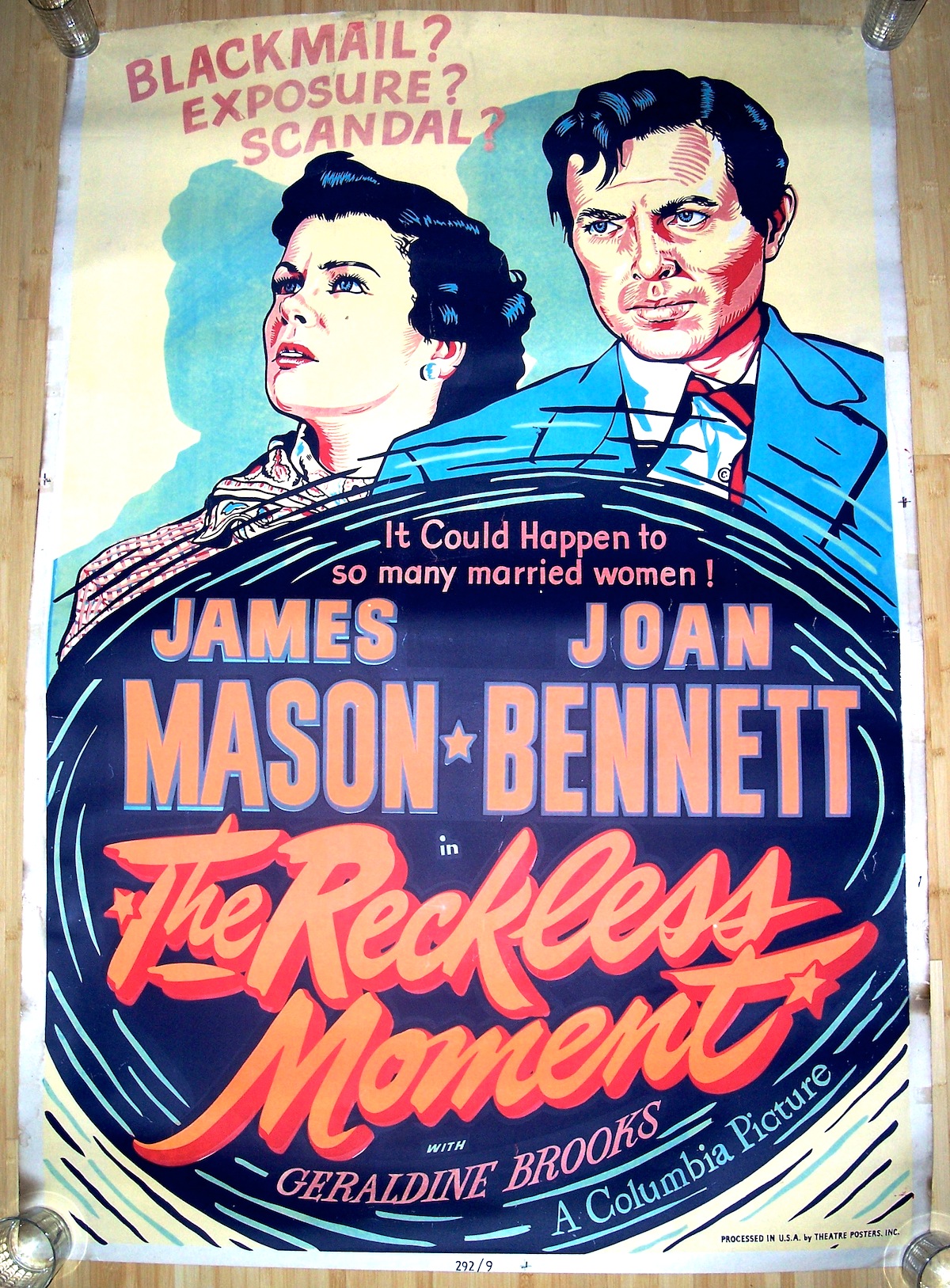 Back when movie posters were important as advertisements, and many theaters were independently run, some printing companies offered posters that functioned as alternatives to the studio-approved designs. Theaters looking to promote a film in a unique or high-impact way could order these alternative posters and display them in their lobbies. I believe this large, silk-screened take on Ophuls’ “The Reckless Moment” is one of these “alternative” posters. The tone of the image totally misrepresents the picture, but I like its bright, comic-book flair.