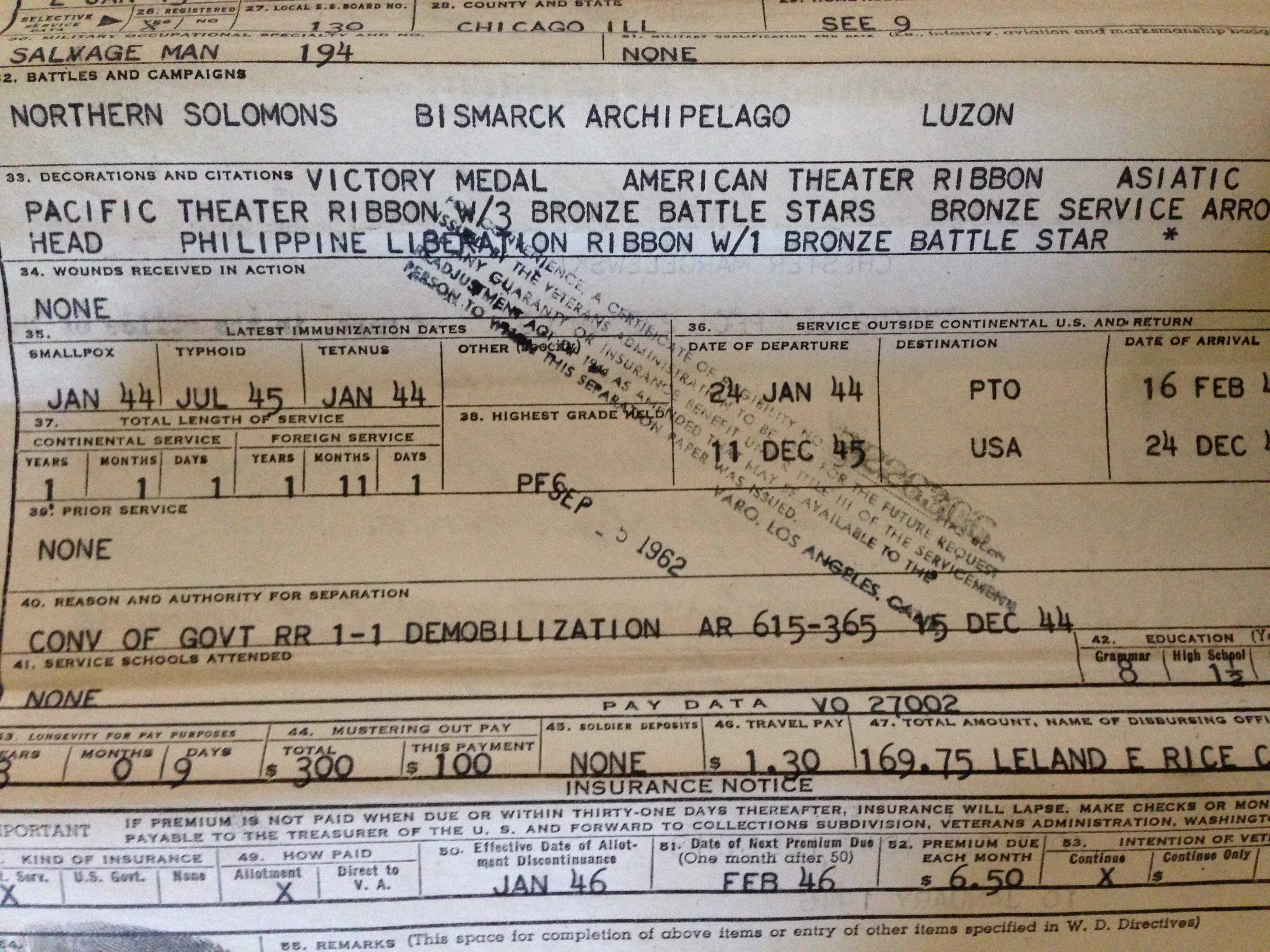 PFC: For a while I didn’t do nothin’. Illinois was one of the few states that gave you a bonus, so I got an extra $300. When they let us go there were all these cabs to take the guys home. I took a streetcar. When I got off, your uncle Frankie was walking right towards me. I didn’t recognize him! It had been, oh, three years and if he didn’t talk I wouldn’t have known who he was. When I got home he was wearing practically all my clothes! That $300 came in real handy.illinoiscert