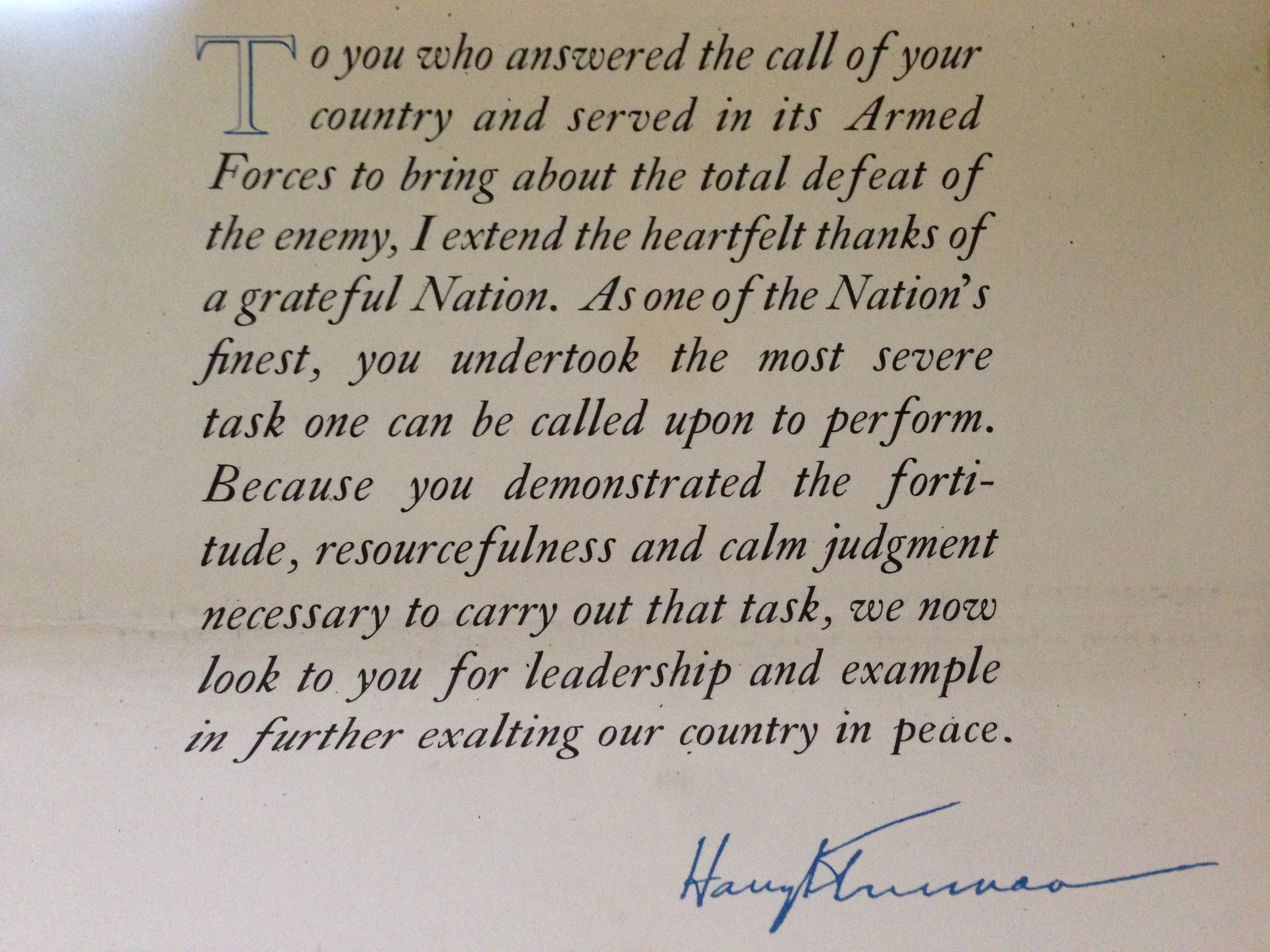 That discharge letter signed by Truman is interesting, particluarly the bit about “we now look to you for leadership and example in further exalting our country in peace.” I wonder if discharge letters nowadays have a similar passage.